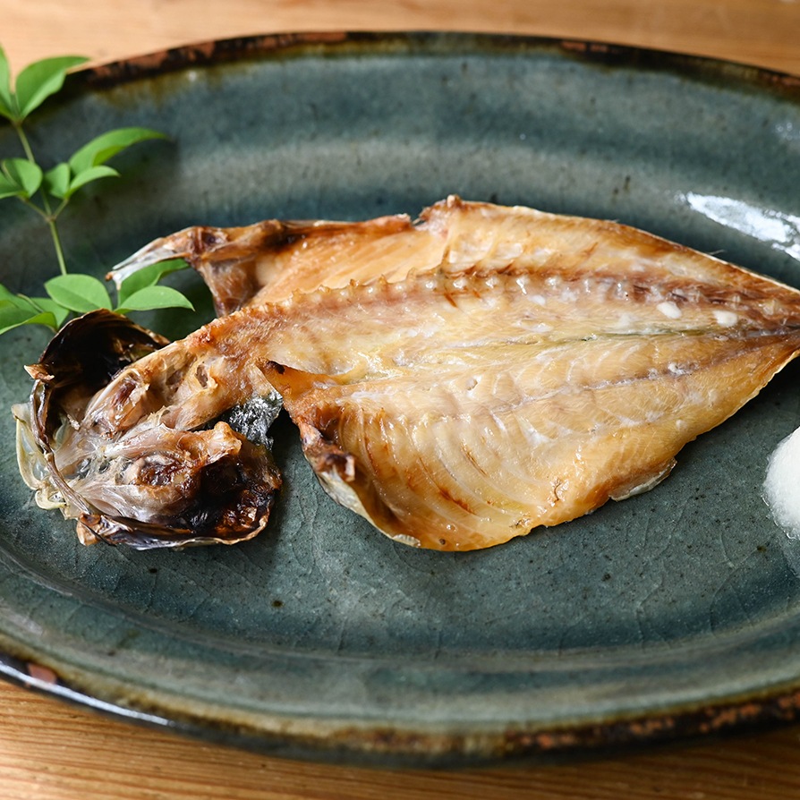 浜田港島根県西部沖で獲れるマアジは脂ののりが良く、浜田港に水揚げされるマアジは他産地のものより脂質含有量が高いため、より脂ののりが楽しめる開き干しすることで旨味が凝縮され、あぶるとこうばしい香りが漂い、脂がしたたり食欲をそそります